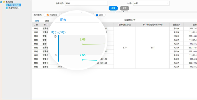 系統(tǒng)管理員可查看協(xié)同系統(tǒng)的使用情況,如在線人數(shù)趨勢(shì)等。組織中的人員還可查看自己與其他人之間的工作關(guān)系指數(shù)。
