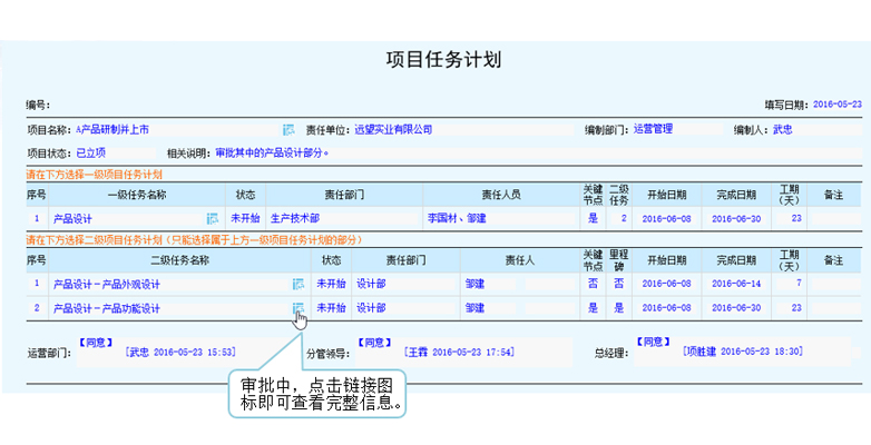 項(xiàng)目立項(xiàng)審批完成后,相關(guān)的項(xiàng)目信息自動(dòng)保存,之后相關(guān)部門(mén)(如運(yùn)營(yíng)管理部門(mén))即可編制項(xiàng)目任務(wù)的相關(guān)計(jì)劃了。