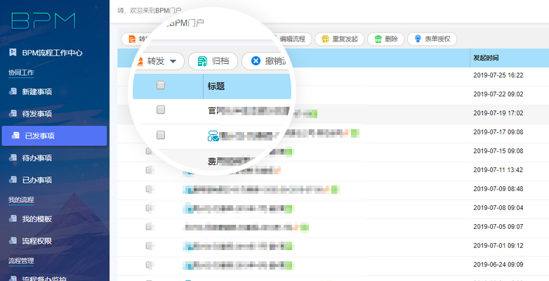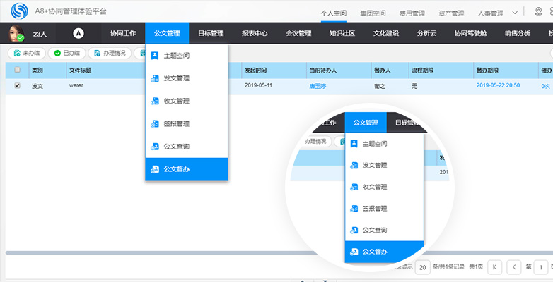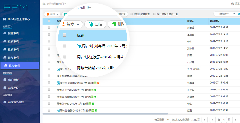 可查看/自定義全文檢索:可篩選協(xié)同、表單、公文、計(jì)劃、會(huì)議等,也可按發(fā)起人、搜索時(shí)間、起止時(shí)間、熱門(mén)搜索進(jìn)行相關(guān)搜索。