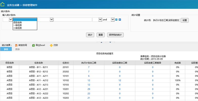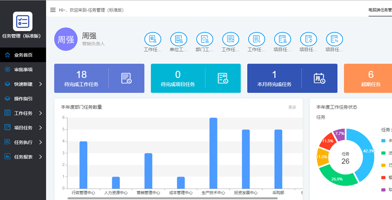 在任務(wù)計(jì)劃管理的空間中,相關(guān)的管理信息數(shù)據(jù)、統(tǒng)計(jì)圖表在一個(gè)頁(yè)面中展現(xiàn),管理者可方便地隨時(shí)查看相關(guān)內(nèi)容。