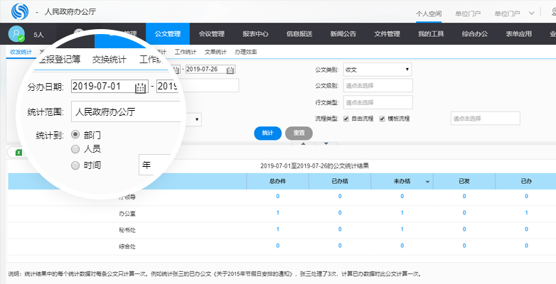 支持多維度查詢處理過(guò)的公文,并支持excel導(dǎo)出。支持收發(fā)查詢和收發(fā)統(tǒng)計(jì),便于對(duì)過(guò)程和結(jié)果進(jìn)行分析。